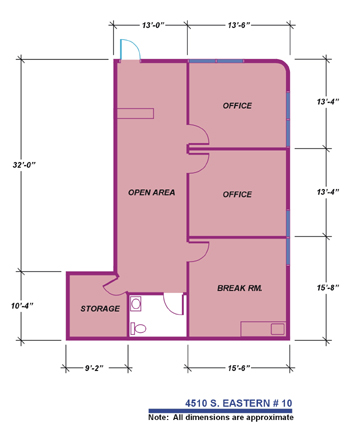Property is located at the corner of Eastern & Harmon. Suite has Reception, Large open area 3 offices, Break Area, Restroom.