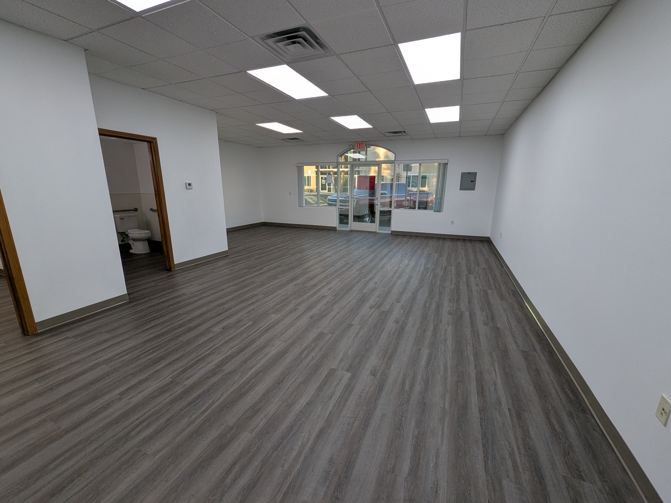 This unit includes a large reception/showroom area, three private offices, and a restroom. The office space is approximately ±1,071 square feet and is available under a modified gross lease with no CAM expenses. The landlord will be responsible for maintaining the office HVAC.
